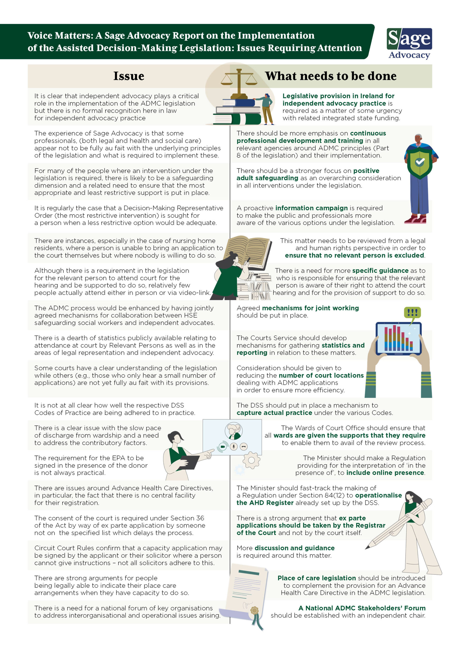 Two years on from the commencement of the Assisted Decision-Making Acts, the scoping document, Voice Matters, reviews Sage Advocacy’s experience of this landmark legislation in practice. It examines the organisation’s experience of implementation; suggests how application of the legislation can be further encouraged; and proposes process and system improvements needed to ensure that the rights enshrined in the Acts can be accessed and enjoyed to the fullest.